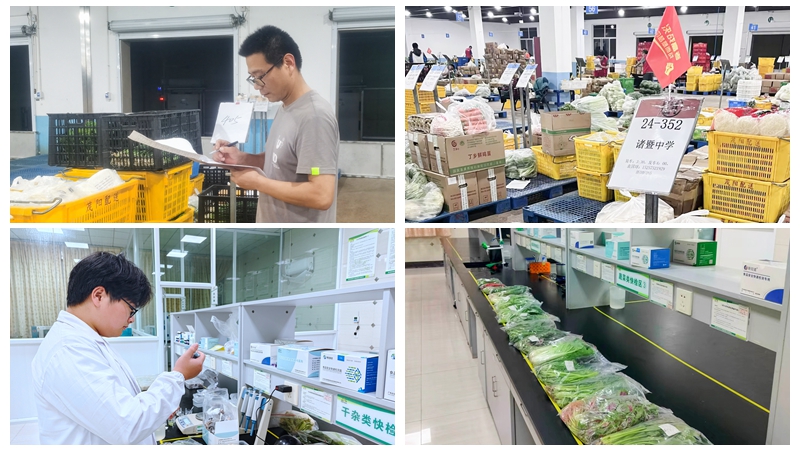 檢測室內同樣忙碌,檢測人員緊張有序地工作著。高考期間,單日檢測品類達200余個?!皩Σ少弫淼摹⑵弊C齊全的食材,我們都會取樣檢測。只有通過檢測了我們才會進行分揀配送。”質量技術部負責人侯戰鋒表示,高考期間較平時加大了檢測頻次,各類檢測項目多達39項,實現全品類、全批次檢測。期間,浙農茂陽的CNAS國家實驗室還對各區域公司產品進行了隨機復測抽檢。4天里,檢測團隊及時發現并銷毀了兩批次農殘超標的千禧果、沃柑等果蔬,確保送出食材質量安全。