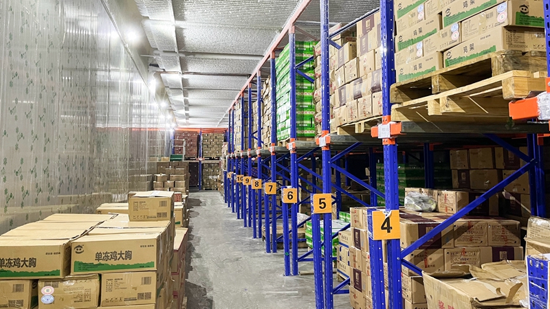 一扇扇厚重的冷庫大門前,4℃、-18.2℃、-24.1℃……各顯示屏上精準顯示著門內各自的溫度。打開門,白色冷霧縹緲,儲物架上一箱箱凍品標簽明顯、排列整齊。走近了聞,是干爽冷冽的涼氣,沒有一點異味?!拔覀兊睦鋷煸趨^域內行業領先。”諸暨分公司倉儲部負責人邊晨升自豪地說。2022年,諸暨分公司新建冷藏冷凍庫5500立方米,并搭配智能監控與移動端操作系統,進一步提升了公司倉儲條件,實現了凍禽、水產、蔬菜等的專倉儲存,有效避免串味與不當儲存造成的損耗問題。冷庫還專門設置了轉運倉,可以臨時存放即將運出的貨品,做好全程冷鏈的銜接。